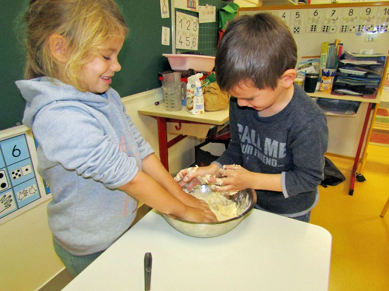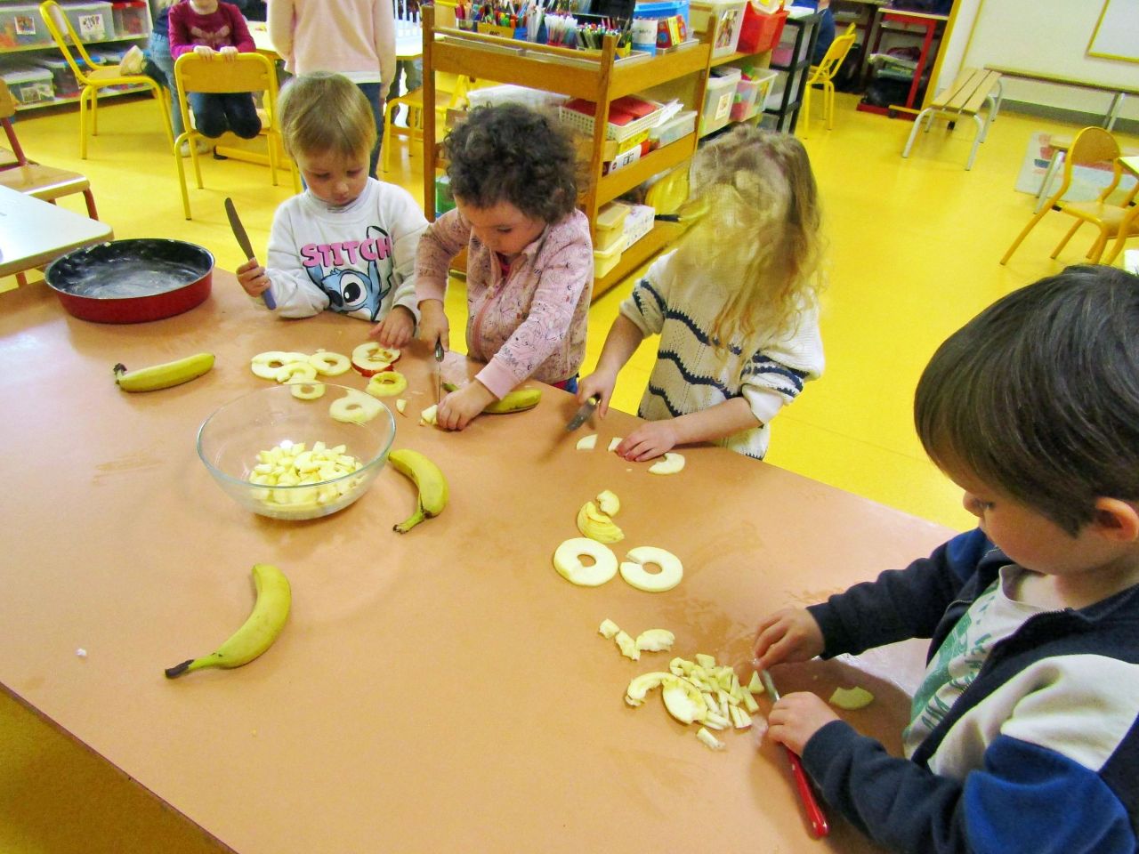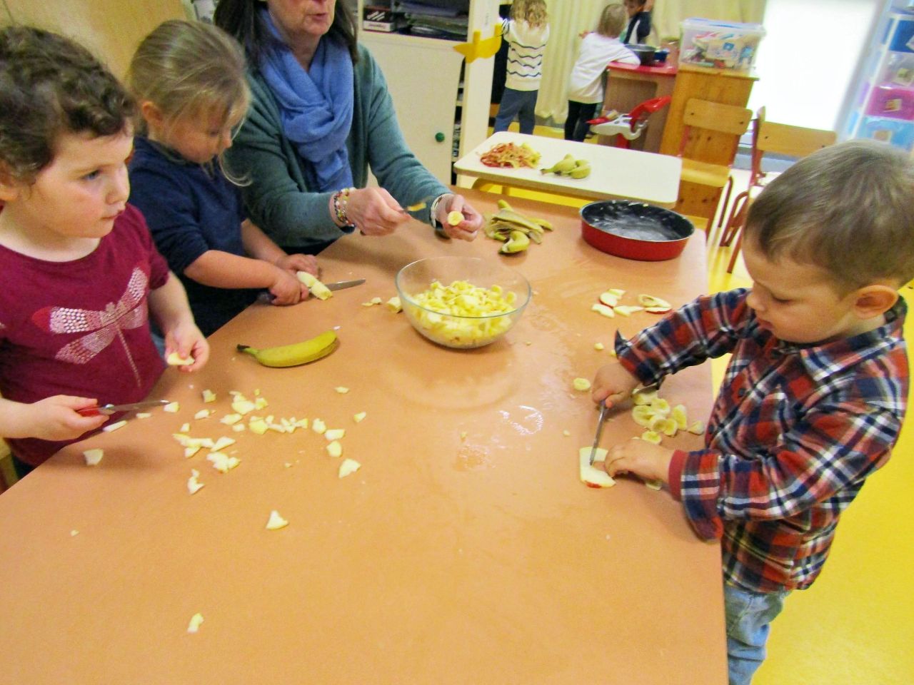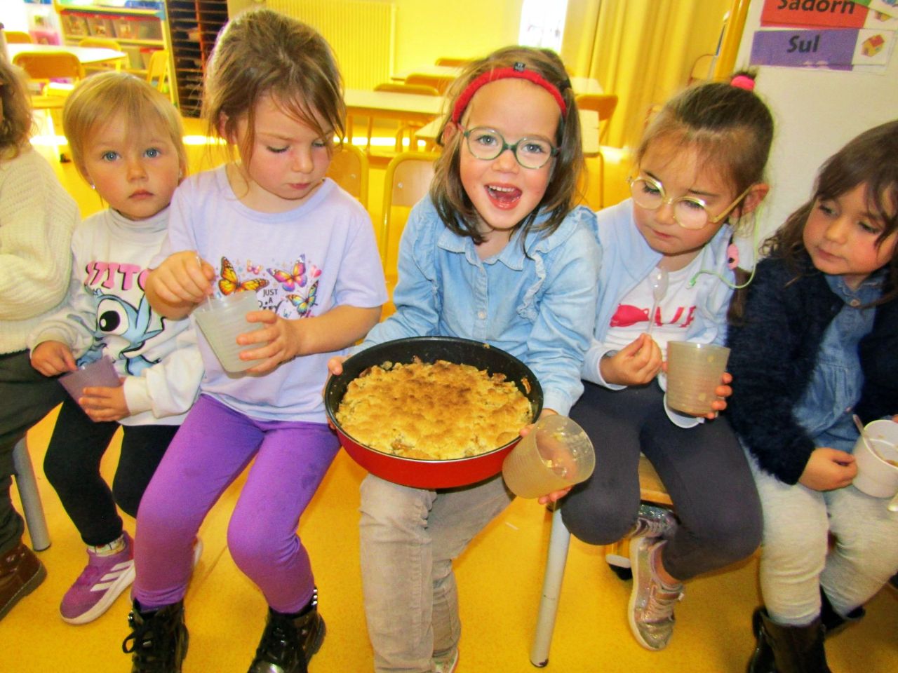 Dans le cadre de la semaine du goût, les élèves de maternelle bilingue ont cuisiné: ils ont préparé (et dégusté!) deux crumbles: un pomme-cannelle, un pomme-banane. Voici la recette et quelques photos. Menam, menam!